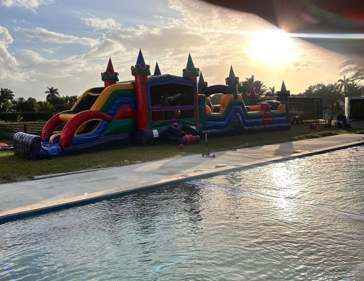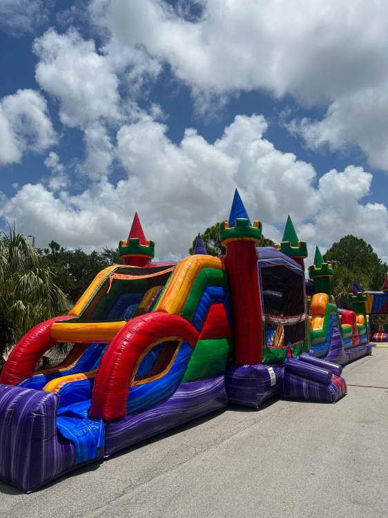 This 63ft Grand Palace Obstacle Course is a towering, action-packed inflatable designed to deliver a full-length challenge and big-time fun. Stretching 63 feet from start to finish, it’s built as a continuous course of climbs, crawls, slides, and barriers that keep racers moving and competing side-by-side. The layout encourages speed, agility, and strategy—perfect for tournaments, field days, festivals, or any event where you want guests to race, cheer, and stay active. Durable construction and reinforced seams support repeated use throughout your rental period, while bright, eye-catching colors make the unit a focal point at outdoor or indoor venues with sufficient space and ceiling height. Whether your group is families with kids, teen teams, or adults seeking playful competition, this obstacle course delivers a long, exciting run that’s as satisfying to complete as it is entertaining to watch.
